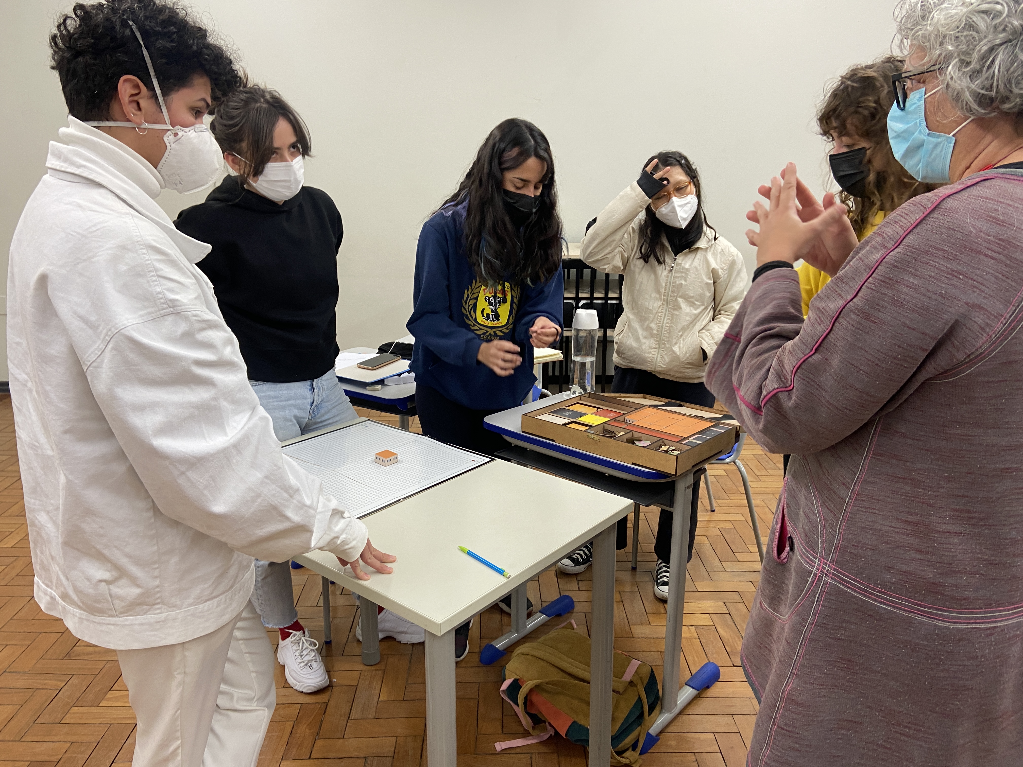 Students at the architecture school. Everyone still wears masks here always.